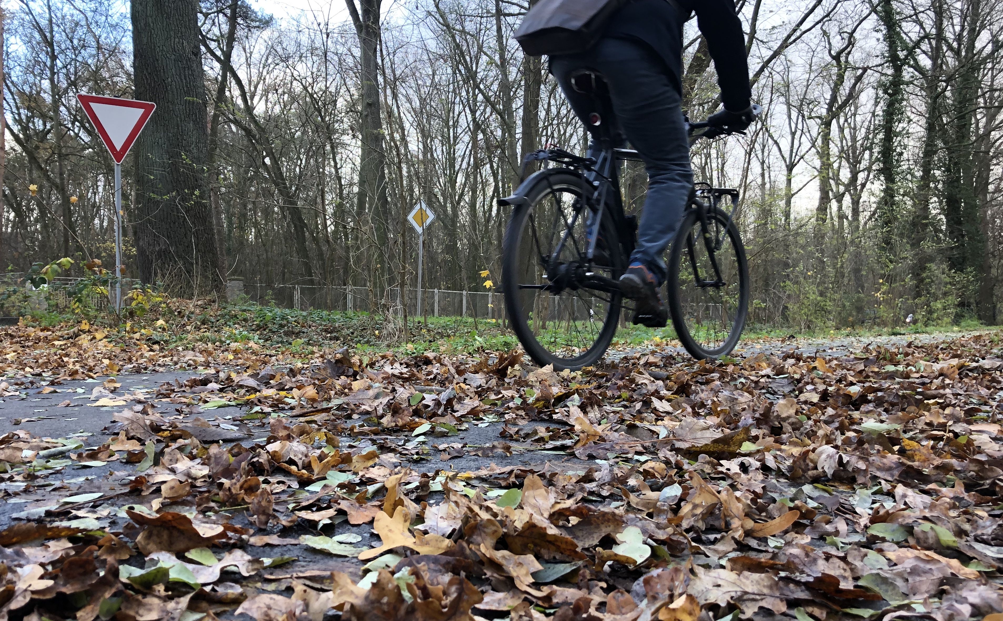 Radfahrer fährt über mit Laub bedeckten Radweg